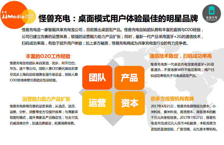 10月30日,全球领先的新经济行业数据挖掘和分析机构iiMedia Research(艾媒咨询)权威发布《2017上半年中国共享充电宝行业专题研究报告》,对2017年上半年的中国共享充电宝市场做了全面、细致的分析研究。报告指出,凭借其自身良好的运营能力以及强大的资金实力,共享充电宝领域的明星品牌企业怪兽充电后来居上,跻身中国共享充电宝行业综合实力排名第一梯队,成为共享充电宝行业最大黑马。